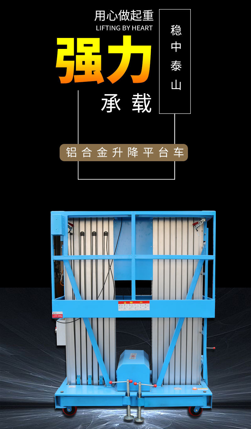鋁合金式升降機整體采用高強度鋁型材精制而成由于型材強度高,具有造型美觀、體積小、重量輕、結構緊湊、移動方便、升降平臺平穩、操作方便、安全可靠等優點,令高空作業更方便快捷,能夠快速、慢速行走,可調速,是現代企業高效安全生產之理想高空作業設備。主要產品分為單立柱鋁合金,雙立柱鋁合金,三立柱鋁合金、四立柱鋁合金。